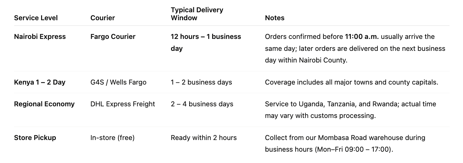 Orders placed Mon–Fri before 14:00 EAT ship the same day; later orders ship next business day.